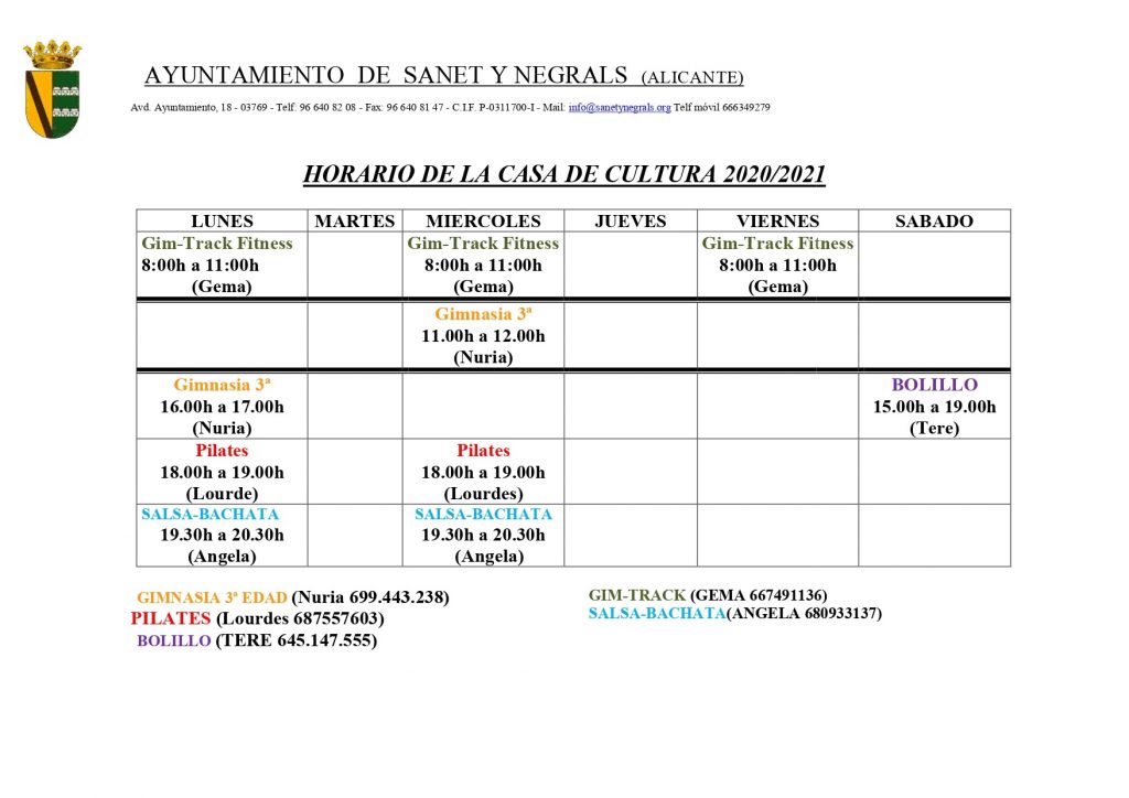 Las personas interesadas en realizar cualquier actividad de las incluidas en el horario deberán llamar al teléfono de contacto existente al lado de la actividad.