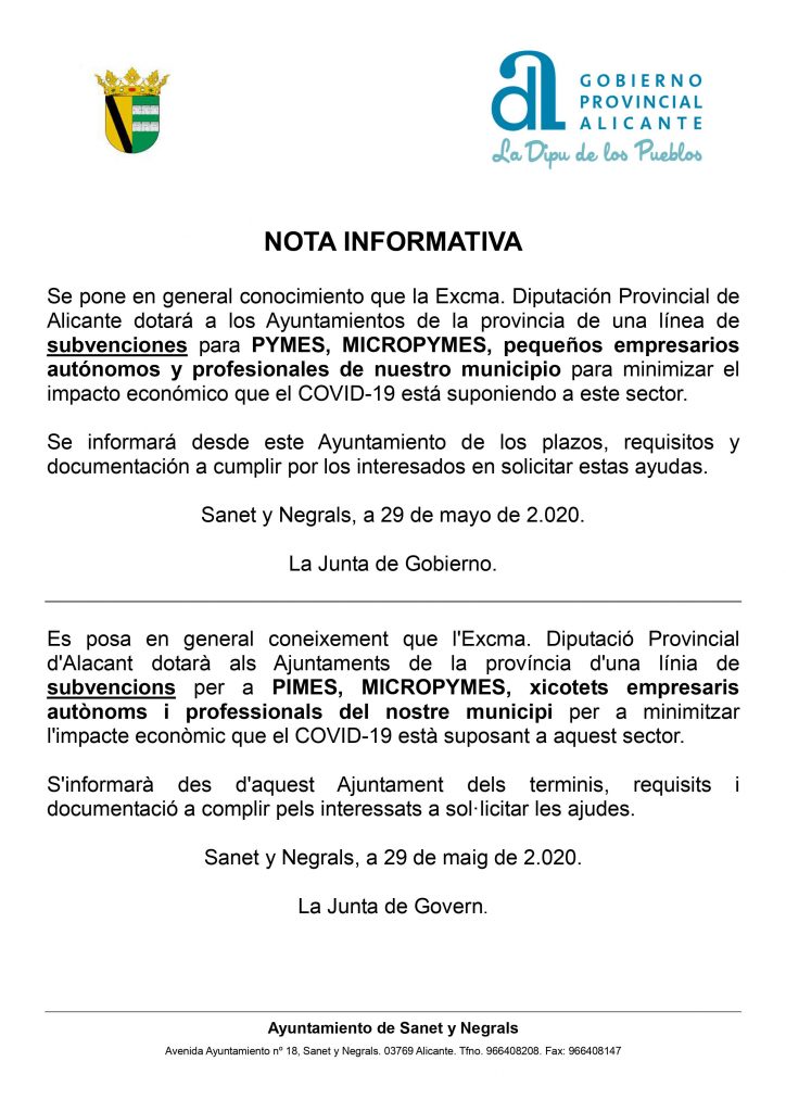 Se pone en general conocimiento que la Excma. Diputación Provincial de Alicante dotará a los Ayuntamientos de la provincia de una línea de subvenciones para PYMES, MICROPYMES, pequeños empresarios autónomos y profesionales de nuestro municipio para minimizar el impacto económico que el COVID-19 está suponiendo a este sector.