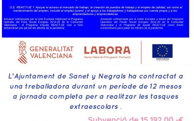 The City Council of Sanet y Negrals has been the beneficiary of TWO monetary GRANTS from the Hon. Alicante Provincial Council for a total amount of €9,648.14. for actions included within the call of the Area of Economic Development and Productive Sectors of the Excma....