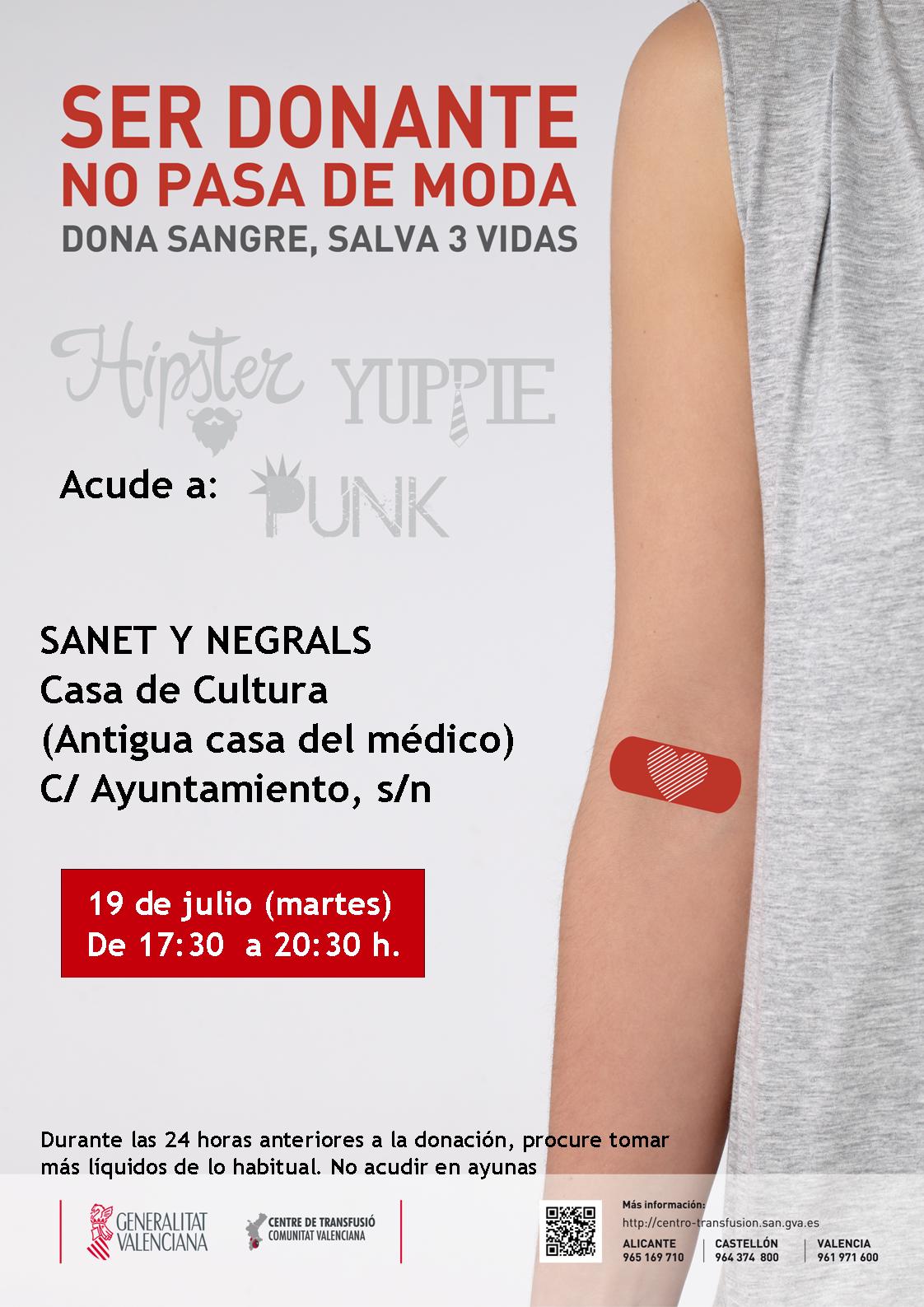 El día 19 de julio (martes) de 17:30 hs. a 20:30 hs., en la Casa de la Cultura de Sanet y Negrals, se realizarán las donaciones de sangre de este mes de julio.