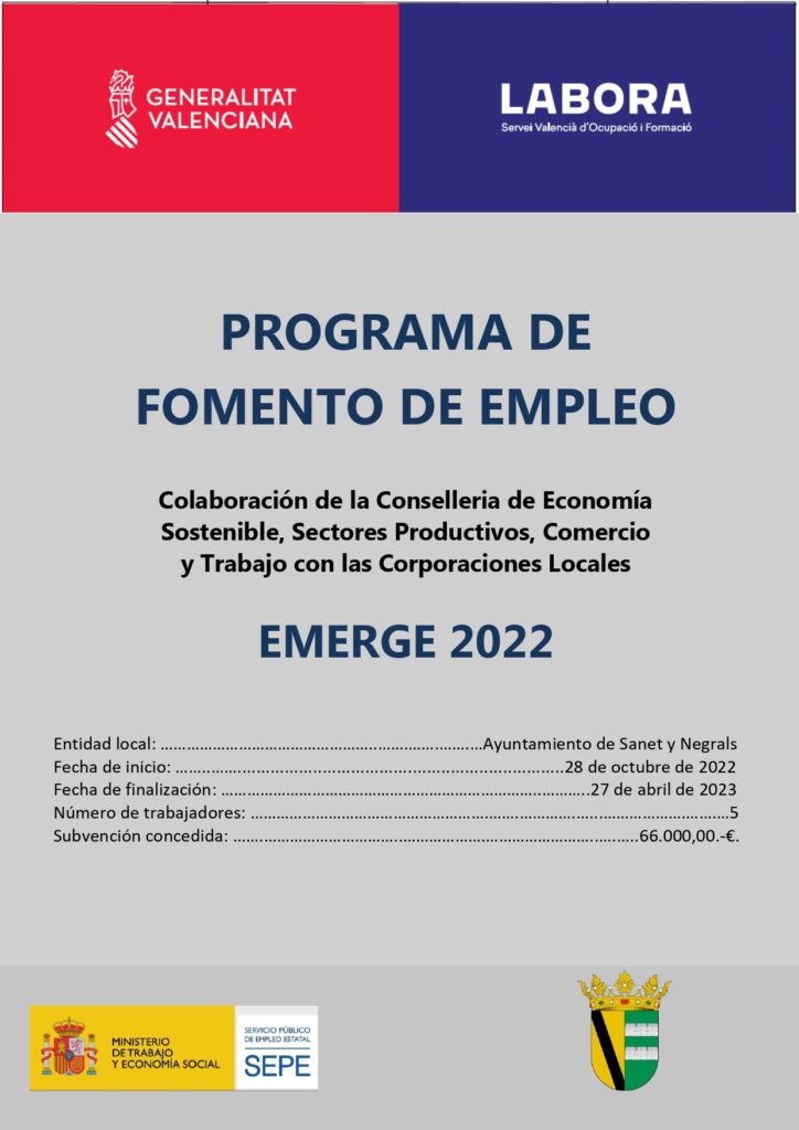 El Ayuntamiento de Sanet y Negrals inició el pasado día 28 de Octubre de 2022 el programa de empleo EMERGE 2022 para la contratación de personas desempleadas por corporaciones locales de la Comunitat Valenciana, para la realización de acciones previstas en planes o procedimientos de emergencias en el ámbito forestal, en aplicación de la Orden 8/2016, de 7 de julio, de la Conselleria de Economía Sostenible, Sectores Productivos, Comercio y Trabajo (AVALEM EXPERIÈNCIA) .