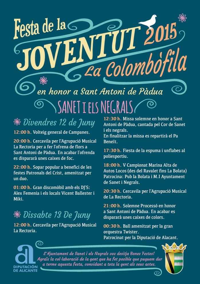 Los días 12 y 13 de junio se celebrarán en Sanet y Negrals las Fiestas en Honor a San Antonio, más conocidas como «La Colombòfila».