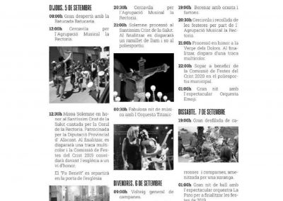 El CORREFOC que tendrá lugar el día 3 de septiembre, será subvencionado por el Área de Cultura de la Excma. Diputación provincial de Alicante, al igual que la CORAL DE LA RECTORIA que cantará la misa solemne en honor al Santísimo Cristo de la Salud del día 5 de septiembre de 2019.