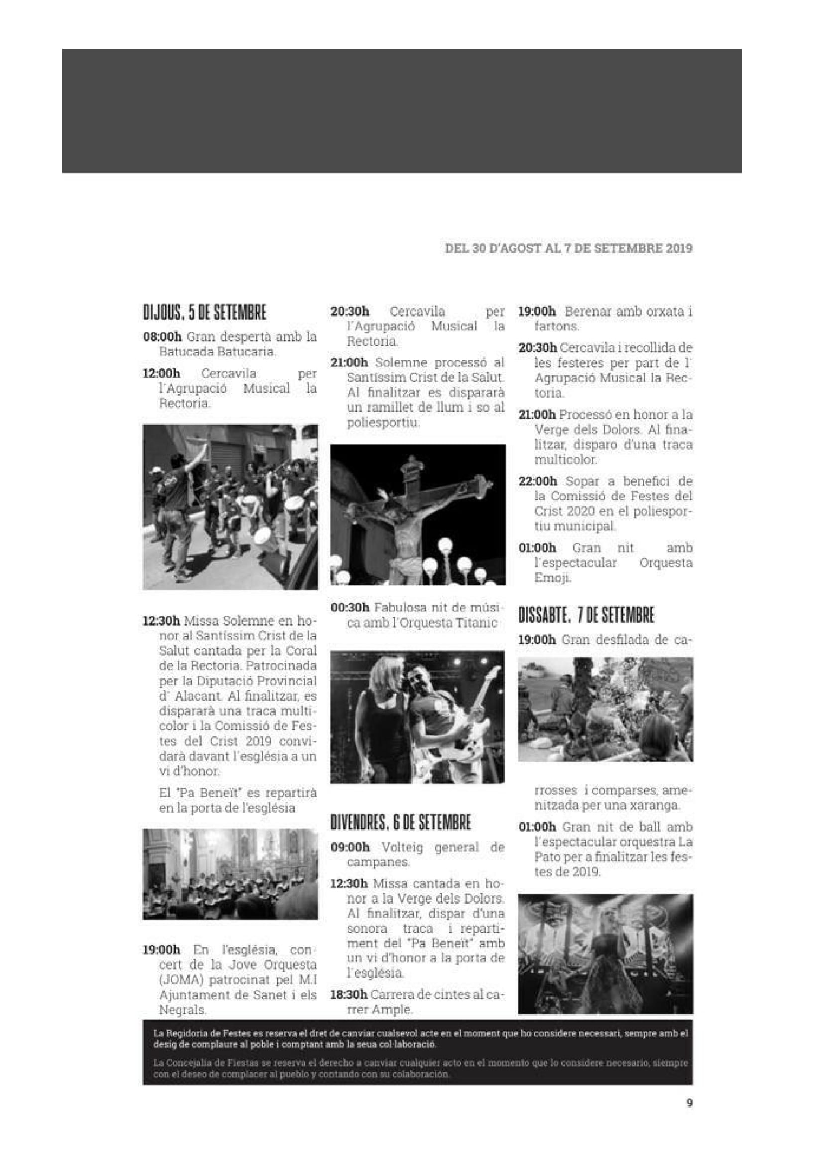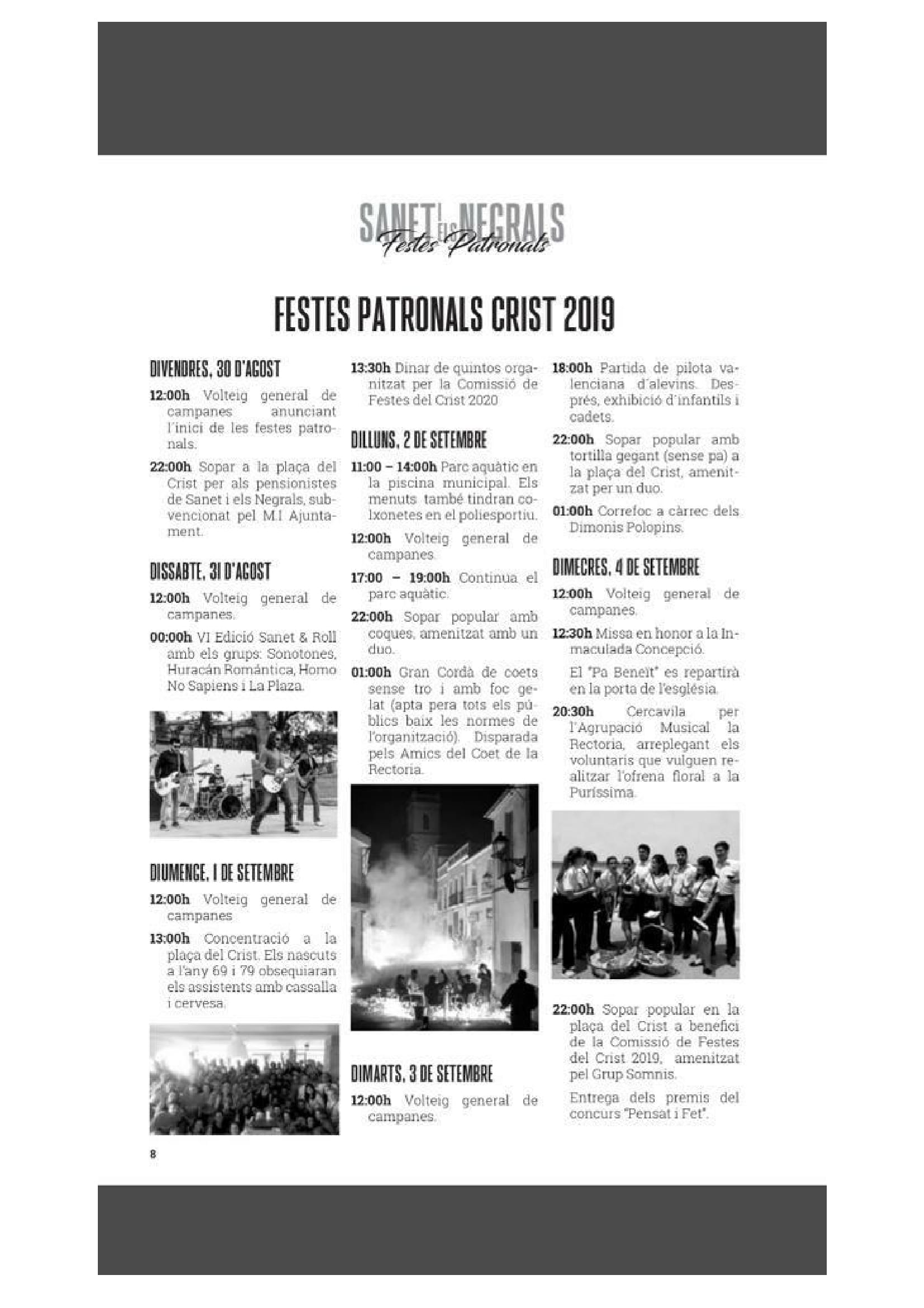 Como todos los años, Sanet y Negrals celebra sus fiestas patronales en Honor al Santísimo Cristo de la Salud, la Inmaculada Concepción y la Virgen de los Dolores.