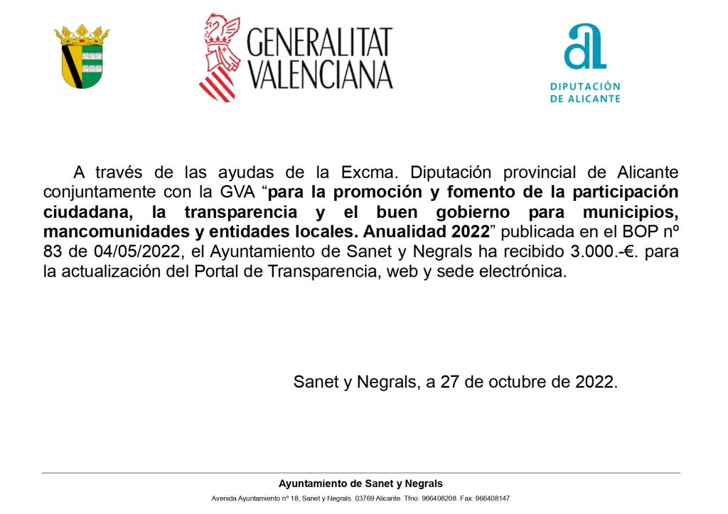 A través de las ayudas de la Excma. Diputación provincial de Alicante junto con la GVA “para la promoción y fomento de la participación ciudadana, la transparencia y el buen gobierno para municipios, mancomunidades y entidades locales. Anualidad 2022” publicada en el BOP nº 83 de 04/05/2022, el Ayuntamiento de Sanet y Negrals ha recibido 3.000.-€. para la actualización del Portal de Transparencia, web y sede electrónica.