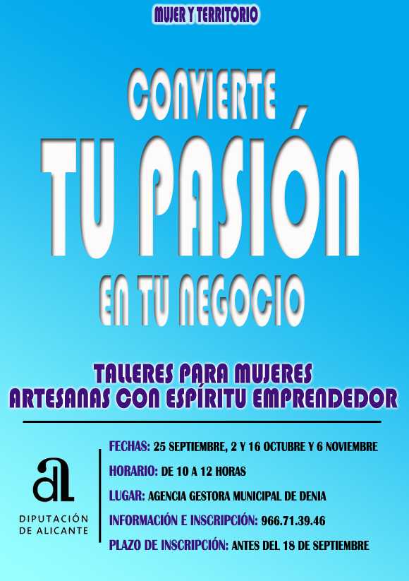 La Excma. Diputación Provincial de Alicante, organiza para el próximo día 24 de septiembre, unos talleres que bajo la denominación MUJER Y TERRITORIO pretenden estimular las potencialidades de las mujeres artesanas fomentando su emprendimiento y contribuyendo a construir una idea de negocio.